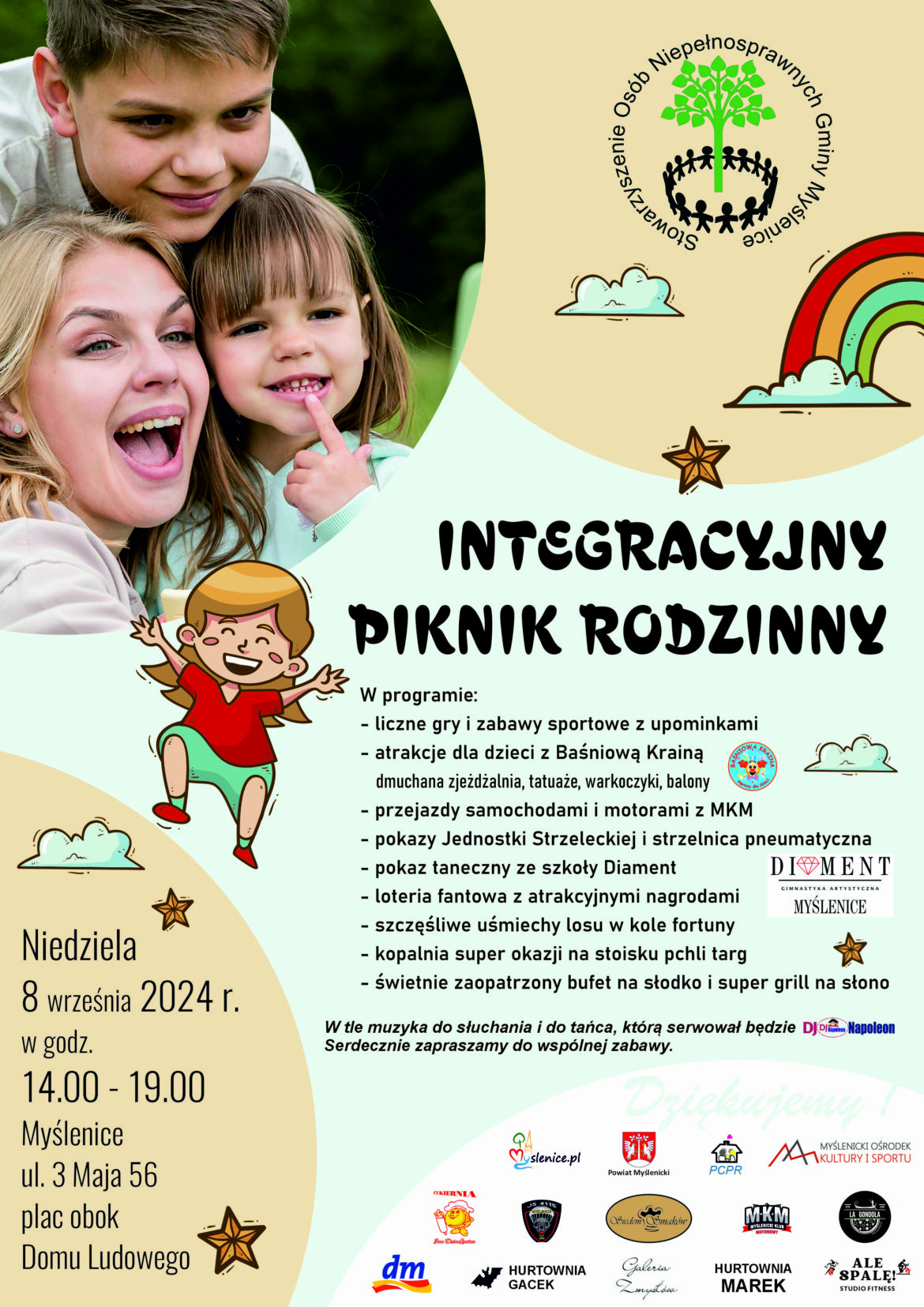 W niedzielę 8 września przy Domu Ludowym na Górnym Przedmieściu w Myślenicach odbędzie się Integracyjny Piknik Rodzinny organizowany przez Stowarzyszenie Osób Niepełnosprawnych Gminy Myślenice. Zabawa będzie trwała od godz. 14 do 19, a w programie m.in.: