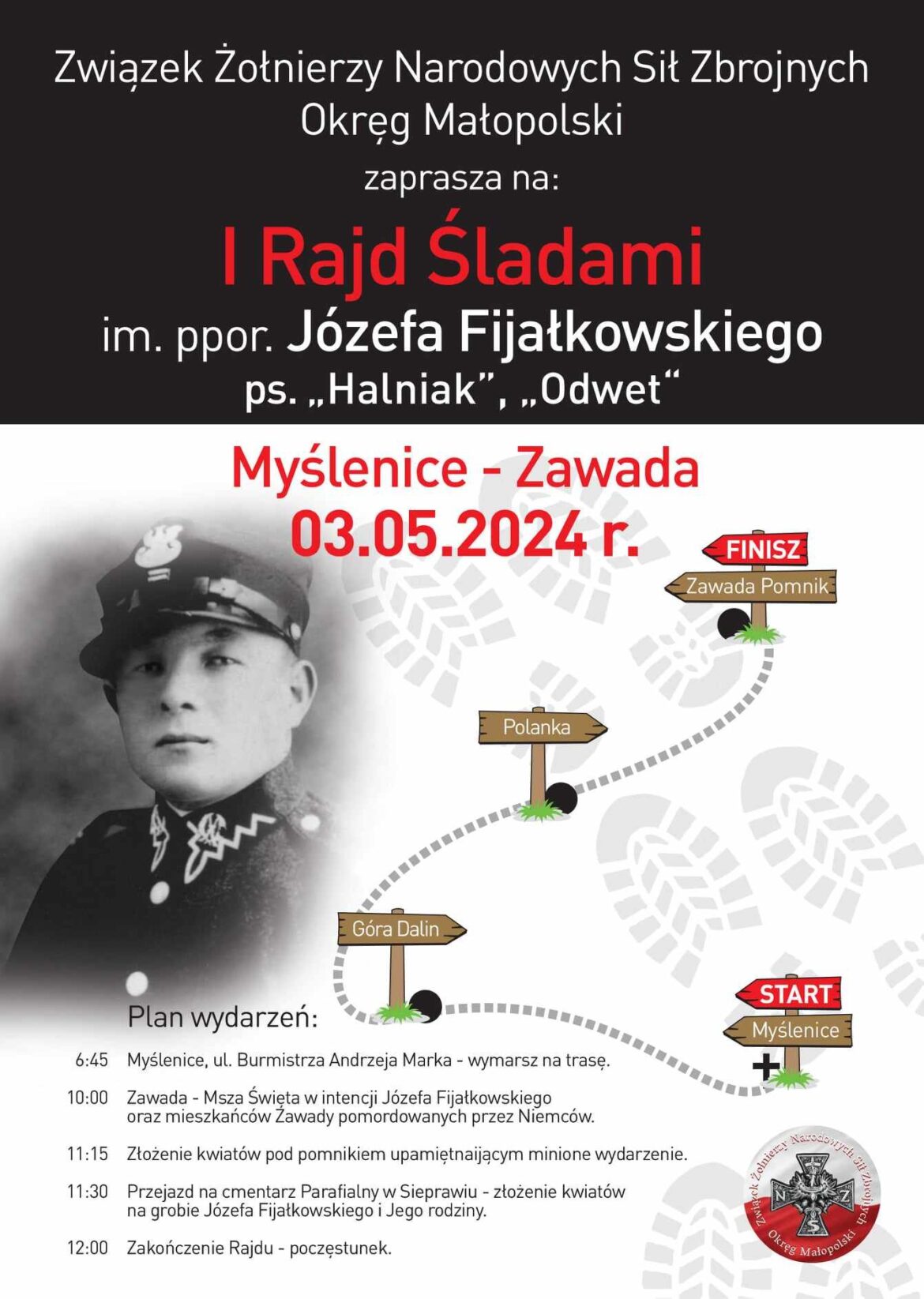 Pierwszą częścią tych obchodów będzie I Rajd Śladami ppor. Józefa Fijałkowskiego. Wymarsz uczestników zaplanowano jest na godz. 6.45 z Myślenic (ul. Burmistrza Andrzeja Marka). Trasa rajdu będzie prowadziła przez górę Dalin i Polankę do Zawady.