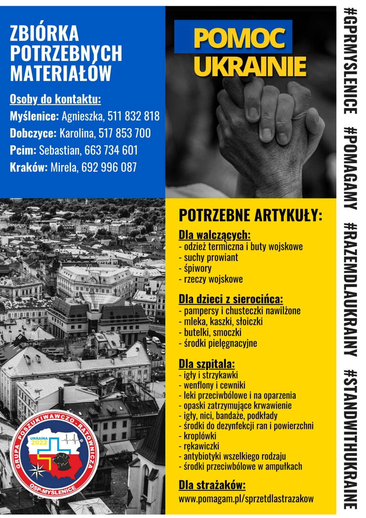 Ochotnicza Straż Pożarna Grupa Poszukiwawczo-Ratownicza Myślenice kolejny raz dołącza do akcji pomocy osób przebywających na Ukrainie. Będzie trwać zbiórka rzeczy, które są najpocześniejsze dla cywilów jak i osób walczących. Każda, nawet najmniejsza pomoc rzeczowa lub wpłata -jest cenna.