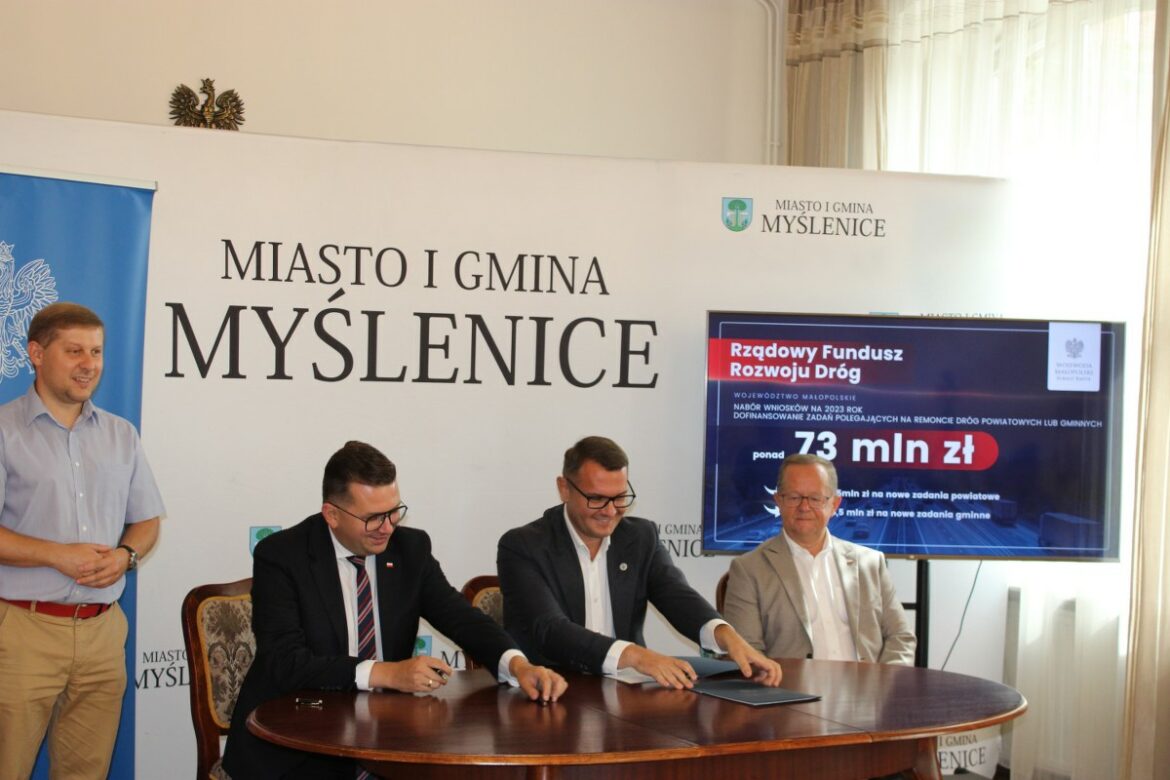 Burmistrz Jarosław Szlachetka wraz z Wojewodą Małopolskim Łukaszem Kmitą podpisali umowę dotyczącą wsparcia finansowego remontu drogi łączącej Głogoczów z Krzyszkowicami. Gmina Myślenice tym razem otrzymała dofinansowanie z Rządowego Funduszu Rozwoju Dróg na realizację zadania pn.: „Remont drogi gminnej nr 540280K odcinek nr 1 w km 0+000,00 – 0+515,00, odcinek nr II w km 1+006,00 – 1+717,00 w miejscowości Głogoczów i w miejscowości Krzyszkowice”. Koszt wspomnianej inwestycji oszacowano na 1 333 467,39 zł, z czego 80% czyli 1 066 773, 00 zł zostanie sfinansowane dzięki wsparciu pozyskanemu z Rządowego Funduszu Rozwoju Dróg, natomiast resztę kwoty pokryje gmina Myślenice ze środków własnych. Termin realizacji zadania wyznaczono na 31 maja 2024 r.