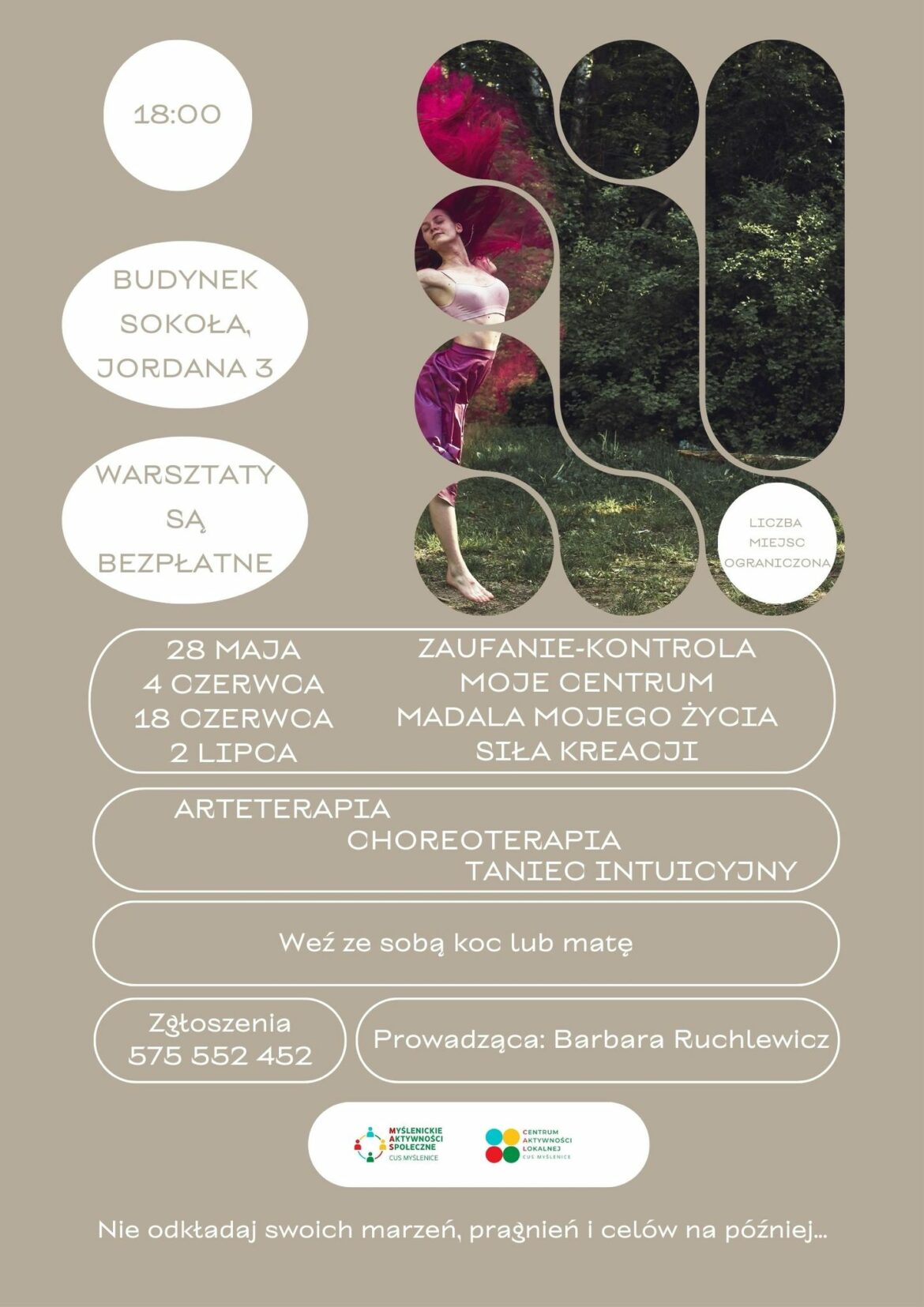 Tego lata stawiamy na zrównoważone ciało i umysł. Pani Barbara Ruchlewicz poprowadzi dla nas zajęcia z elementami arteterapii, choreoterapii i tańca intuicyjnego – czytamy na profilu CAL.