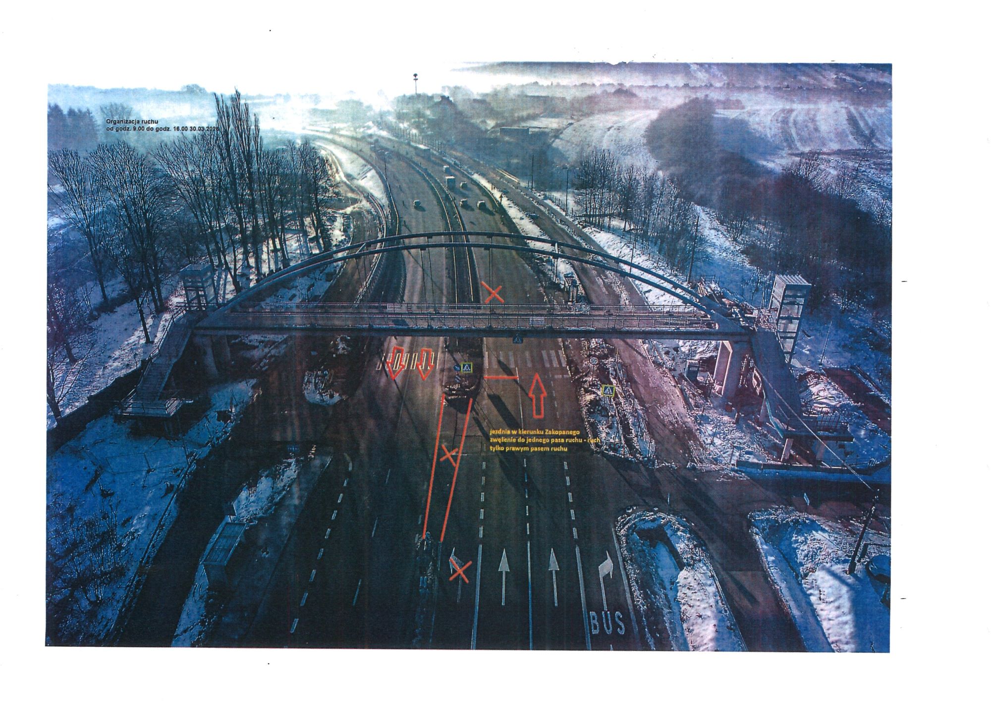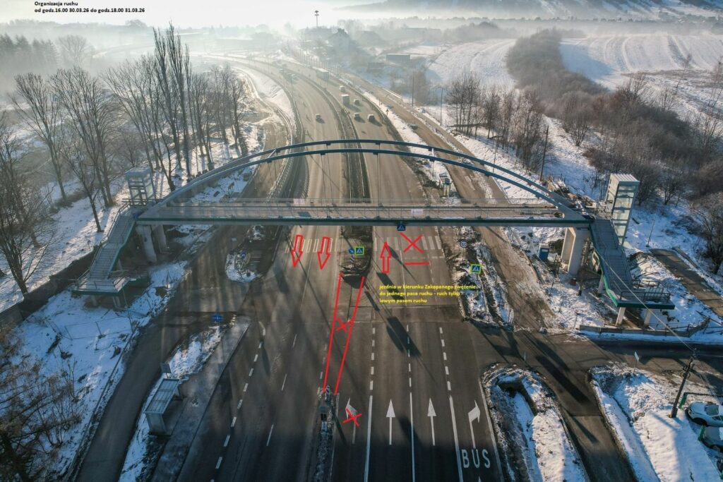 - jezdnia w kierunku Zakopanego (na odcinku od km 693+400 do 694+100) będzie zwężona do jednego pasa ruchu, zamknięty dla ruchu będzie pas prawy jezdni prawej, ruch będzie się odbywał tylko lewym pasem ruchu,