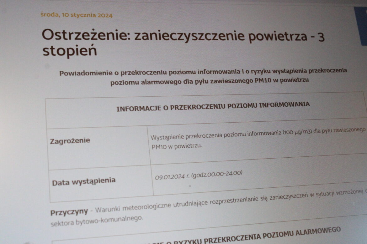 Na cały dzisiejszy dzień (10 stycznia) prognozowana jest zła jakość powietrza. Ogłoszono alert i odradza się przebywanie na zewnątrz i wietrzenie pomieszczeń. Wśród grup wrażliwych na te zanieczyszczenia są szczególnie osoby cierpiące z powodu przewlekłych chorób serca (zwłaszcza niewydolność serca, choroba wieńcowa), przewlekłych chorób układu oddechowego (np. astma, przewlekła obturacyjna choroba płuc), osoby z rozpoznaną chorobą nowotworową, seniorzy, kobiety w ciąży oraz małe dzieci.