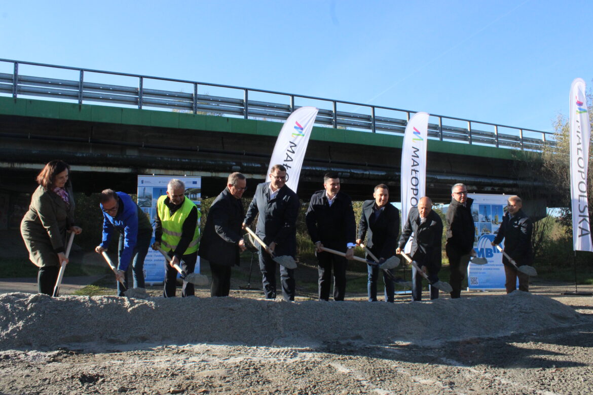 Sama kładka powstanie ok. 100 m poniżej mostu. Ścieżka rowerowa docelowo będzie częścią dużo dłuższej, bo 120-kilomertowej trasy rowerowej VeloRaba łączącej Rabkę z okolicami Niepołomic. W symbolicznym wbiciu łopaty wzięli udział m.in. marszałek województwa małopolskiego Łukasz Smółka i burmistrz Myślenic Jarosław Szlachetka.