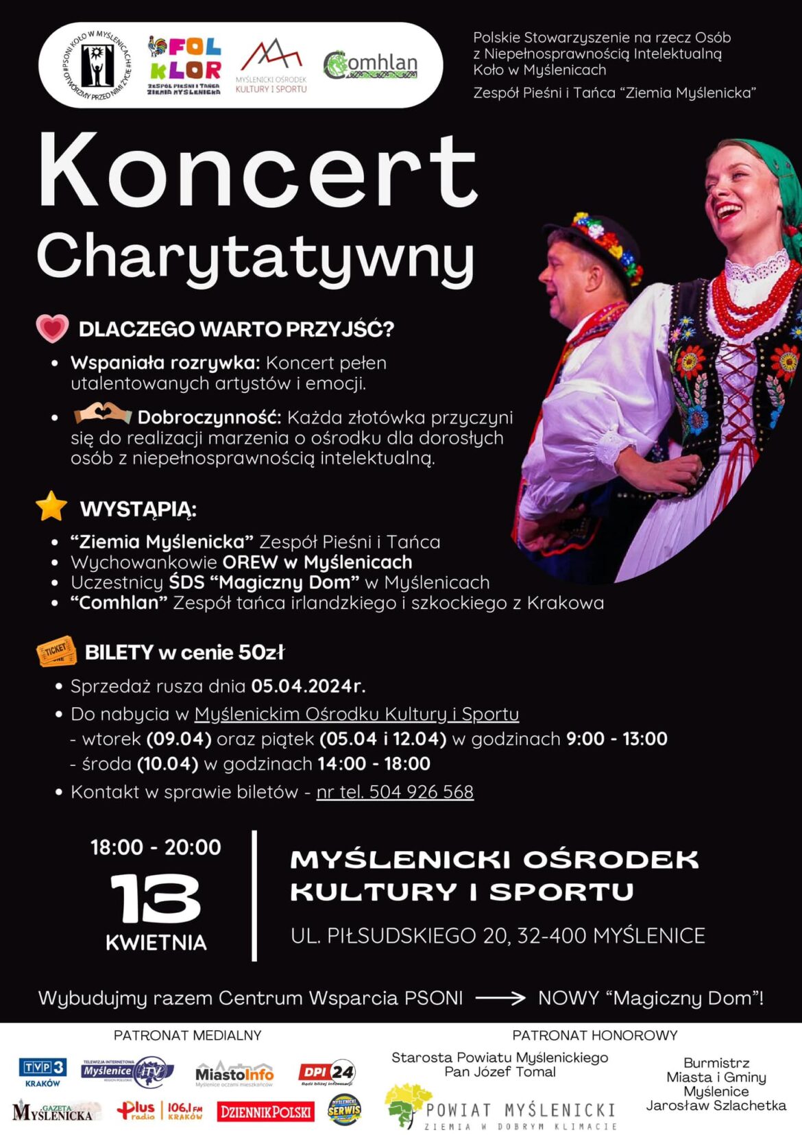W sobotę 13 kwietnia na scenie Myślenickiego Ośrodka Kultury i Sportu wystąpią: Zespół Pieśni i Tańca „Ziemia Myślenicka”, zespół tańca irlandzkiego i szkockiego „Comhlan” oraz uczniowie OREW i uczestnicy ŚDS Magiczny Dom w Myślenicach. Ta wyjątkowa kooperacja ma wspomóc szlachetny cel, jakim jest budowa Centrum Wsparcia PSONI, czyli ośrodka dla dorosłych z niepełnosprawnością intelektualną. Kto chciałby go wesprzeć może to zrobić kupując bilet na koncert.