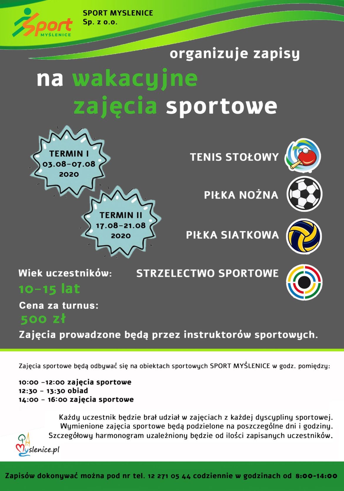 SPORT MYŚLENICE serdecznie zaprasza do wzięcia udziału w wakacyjnych zajęciach sportowych. Wszelkie informacje dostępne na plakacie oraz pod nr telefonu 12 271 05 44.