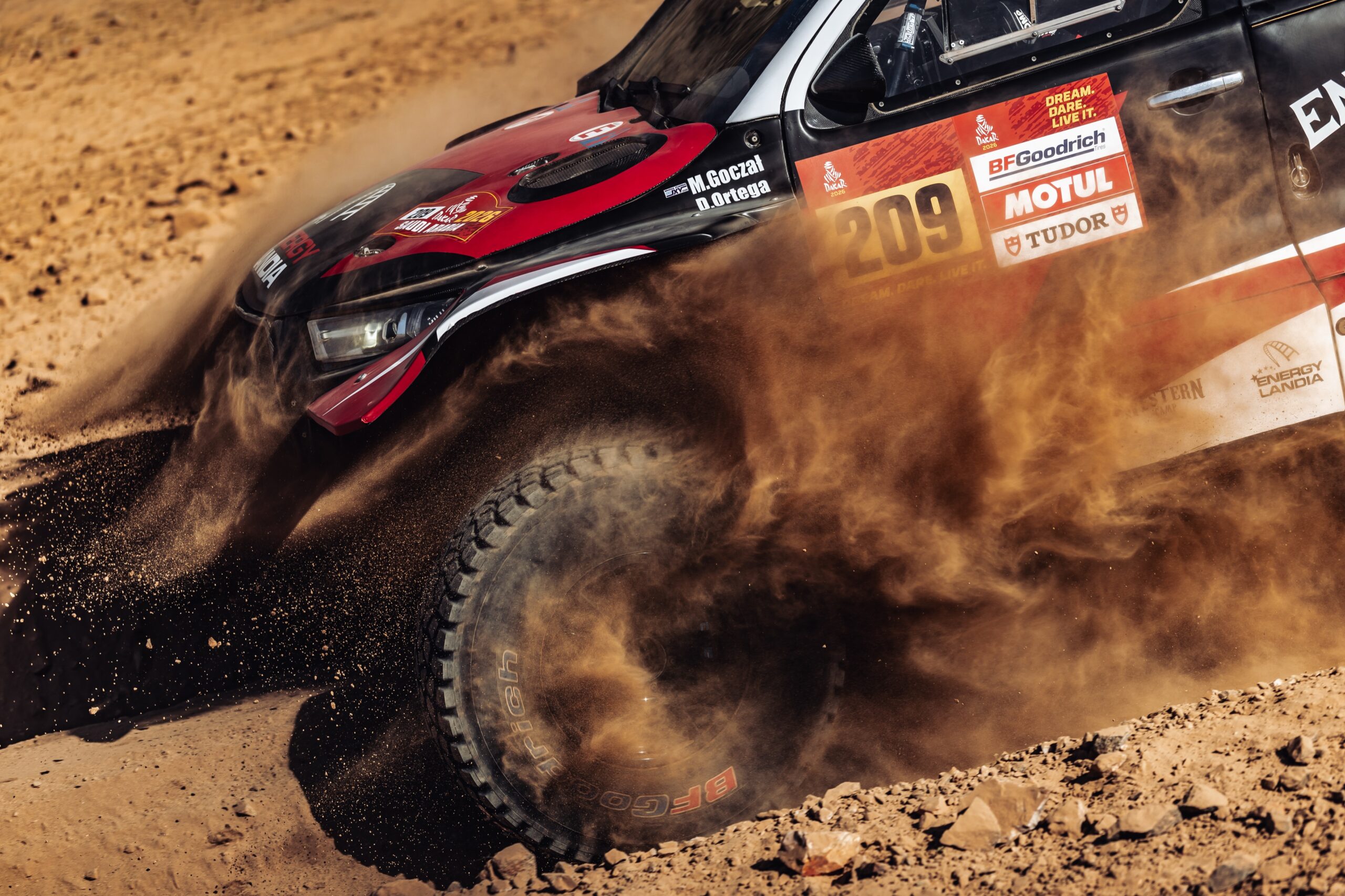 Piąty etap Rajdu Dakar 2026 stanowił drugą część odcinka maratońskiego i prowadził z pustynnego biwaku do Hail. Z racji na fakt, że wczoraj załogi Energylandia Rally Team osiągnęły znakomite wyniki i w komplecie zameldowały się w TOP 6, dzisiaj Polacy byli jednymi z pierwszych na trasie. Jazda z samego przodu stawki oznacza, że zawodnicy nie widzą przed sobą żadnych śladów. Samodzielnie muszą mierzyć się ze skomplikowaną nawigacją i ufać w to, że ich osąd na temat roadbooka jest właściwy. To ogromne wyzwanie dla pilotów. Najszybszą załogą Energylandia Rally Team byli dziś Eryk Goczał i Szymon Gospodarczyk. Mogli oni porównywać się m.in. z Henkiem Lateganem oraz Nasserem Al-Attiyah, którzy jechali bezpośrednio przed nimi, w zbliżonych warunkach. Eryk i Szymon ukończyli 5. etap rywalizacji przed nimi, a przypomnijmy, że Henk i Nasser to aktualnie lider oraz wicelider Rajdu Dakar. To pokazuje, jak dobrą pracę wykonali dziś Goczał i Gospodarczyk i jak znakomicie poradzili sobie z wymagającą nawigacją będąc jedną z pierwszych załóg na trasie. Z nieco większymi stratami do mety dojechali dziś Marek Goczał z Maciejem Martonem oraz Michał Goczał z Diego Ortegą.