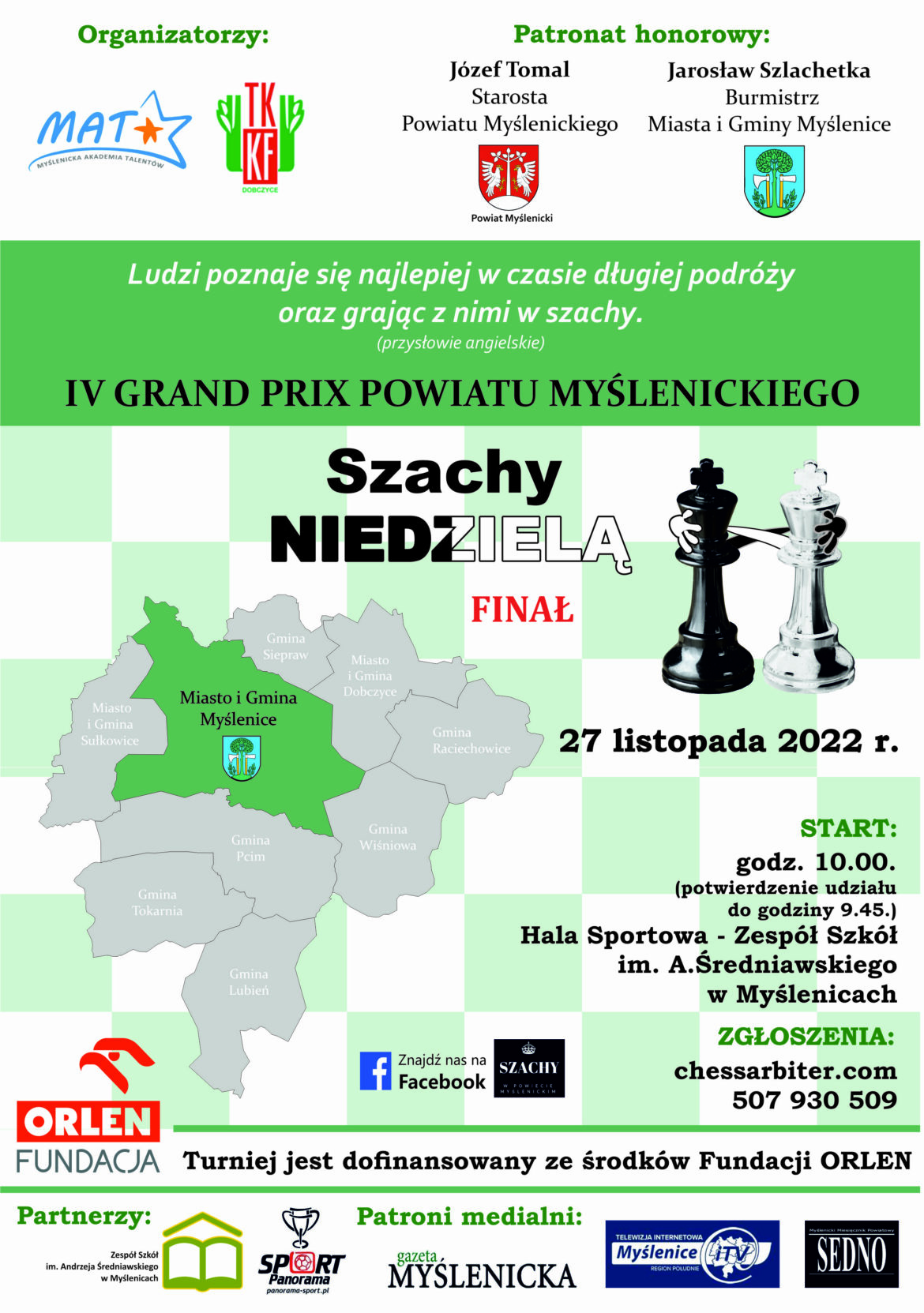 Szachy Niedzielą- połączyły podczas tych spotkań ok 300 szachistów, spośród których większa część wędruje od gminy do gminy rozgrywając turnieje szachowe i zbierając punkty do klasyfikacji generalnej. Do tej pory rozegrano osiem turniejów szachowych w ośmiu gminach powiatu myślenickiego, a wielki finał zaplanowany został w gminie Myślenice.